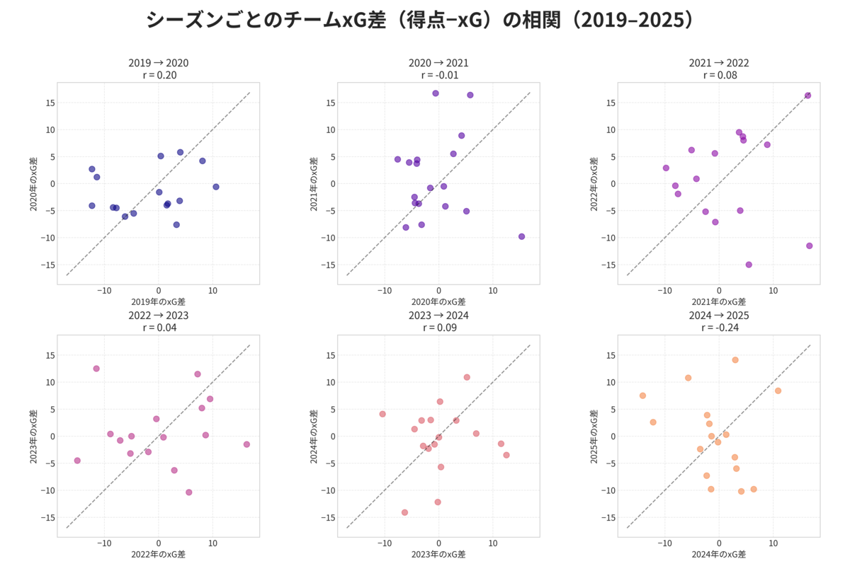2019〜2025シーズンの全選手データをスクレイピングで取得し、各シーズンのデータを統合して「得点−xG」の差分を算出した。これを選手ごとに前年と当年で対応づけ、相関係数を計算した。